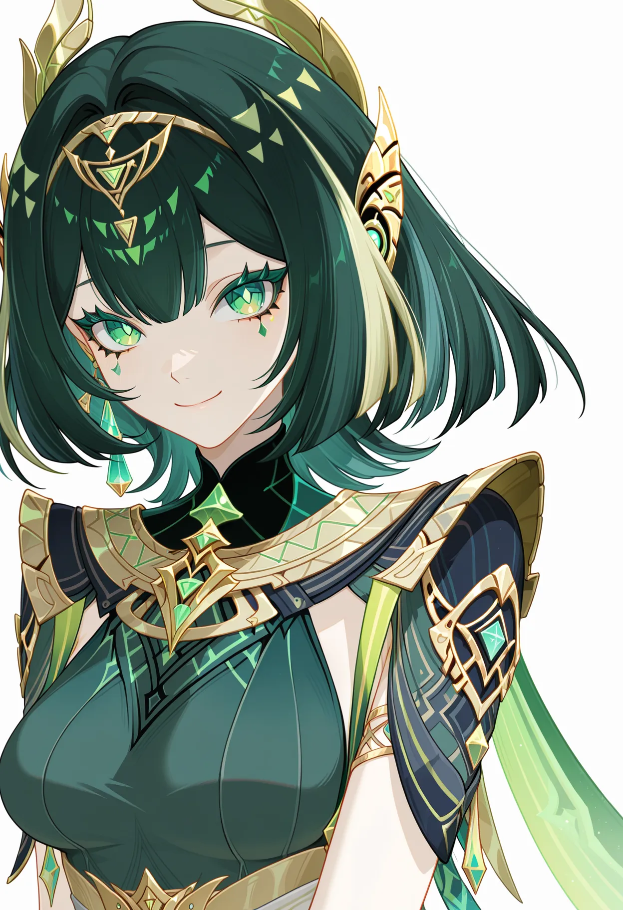 Nefer, 1girl, solo, breasts, white background, looking at viewer, upper body, simple background, jewelry, closed mouth, smile, earrings, hair ornament, medium hair