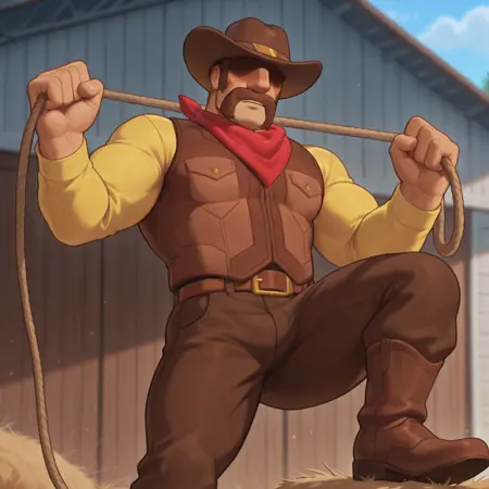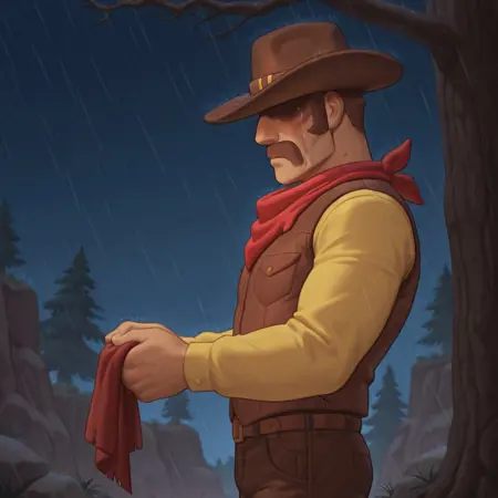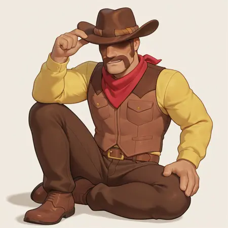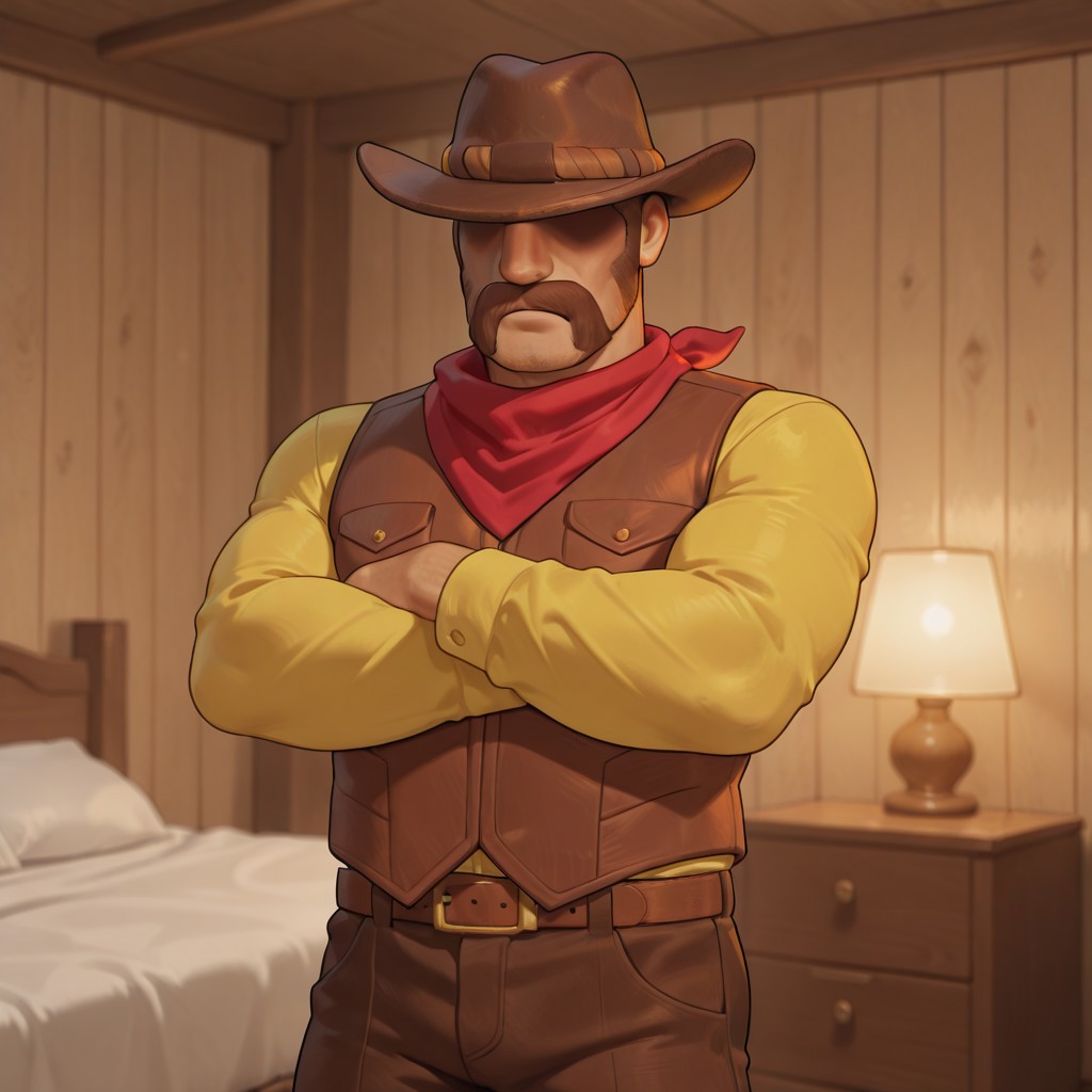 其他标签:棕色头发,浓密的胡子,长长的鬓角,古铜色皮肤,帽子遮住眼睛,眼睛隐藏,牛仔帽,宽边帽,编织帽带,黄色长袖衬衫,棕色背心,红色头巾,棕色腰带,棕色裤子,棕色牛仔靴