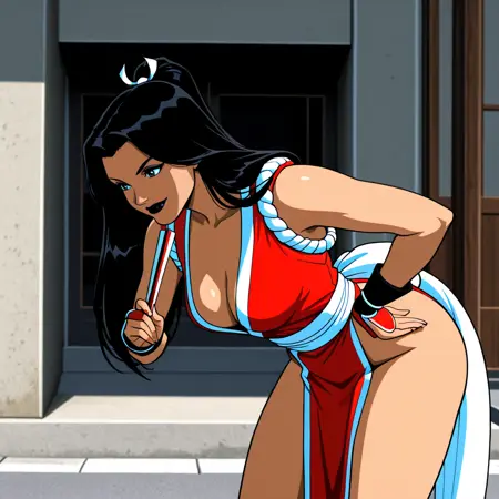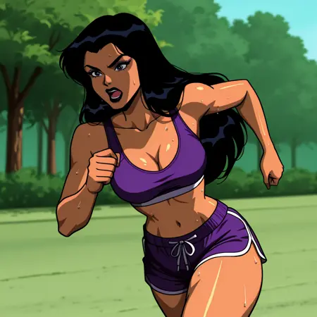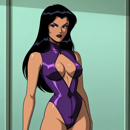 • 트리거: HuntressBrave, 1girl, cape, thighhighs, mask, elbow gloves, lipstick, superhero, long hair, makeup, purple footwear, medium breasts, black hair, belt, leotard, retro artstyle, purple gloves, black lips, cowboy shot