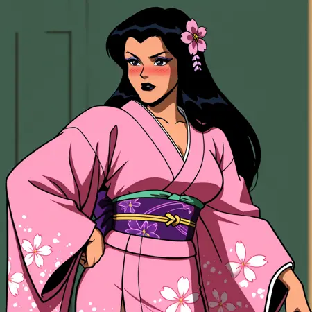触发词:HuntressBrave, 1girl, cape, thighhighs, mask, elbow gloves, lipstick, superhero, long hair, makeup, purple footwear, medium breasts, black hair, belt, leotard, retro artstyle, purple gloves, black lips, cowboy shot