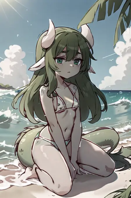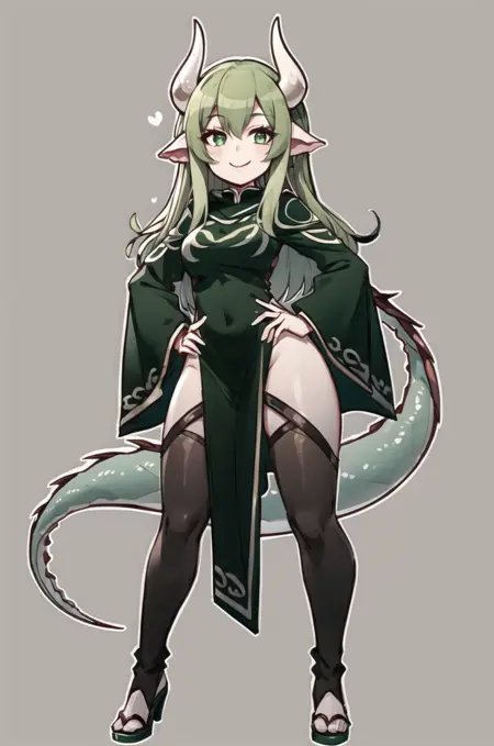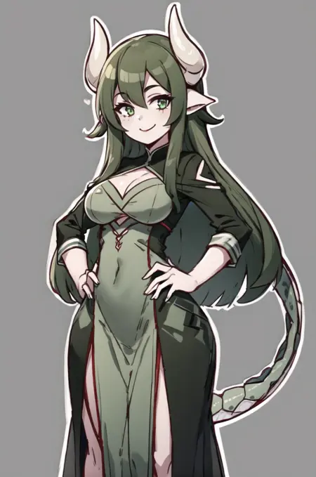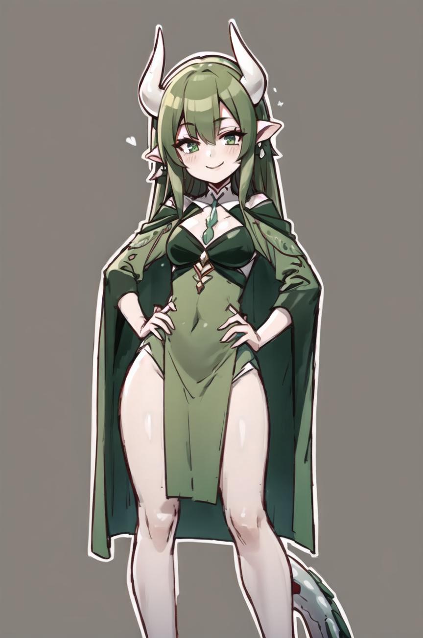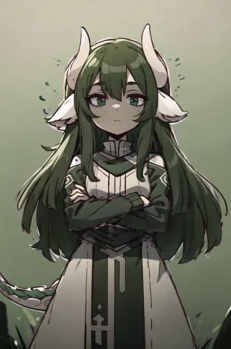 提示词:(Verimeen), 1girl, 绿色头发, 长发, 绿色皮肤, 龙尾, 动物耳朵, 白色角, 头发遮住一只眼睛