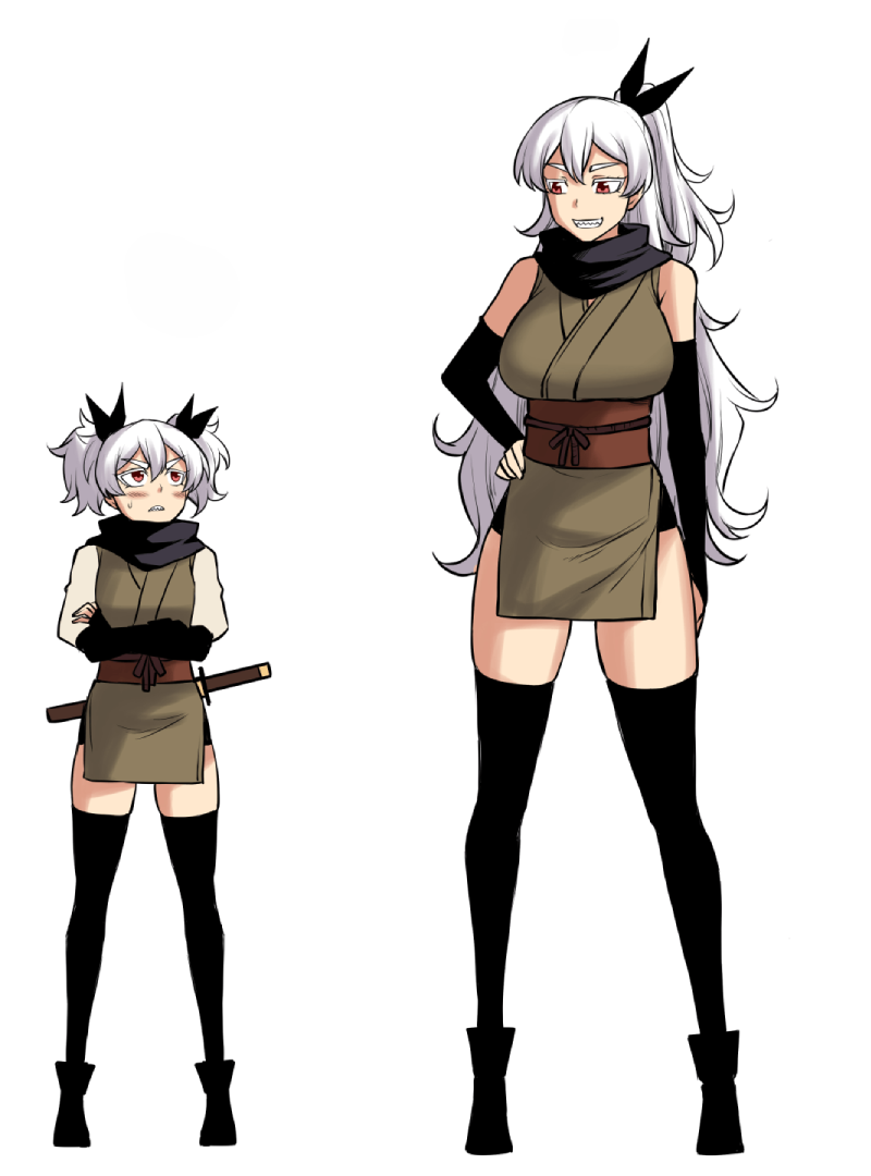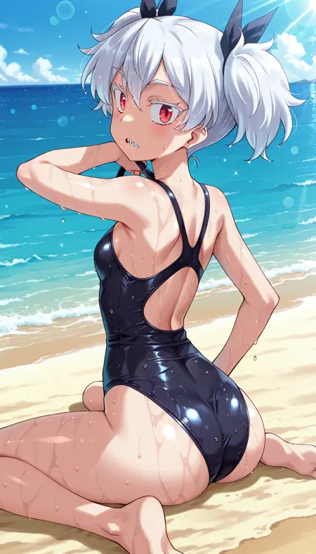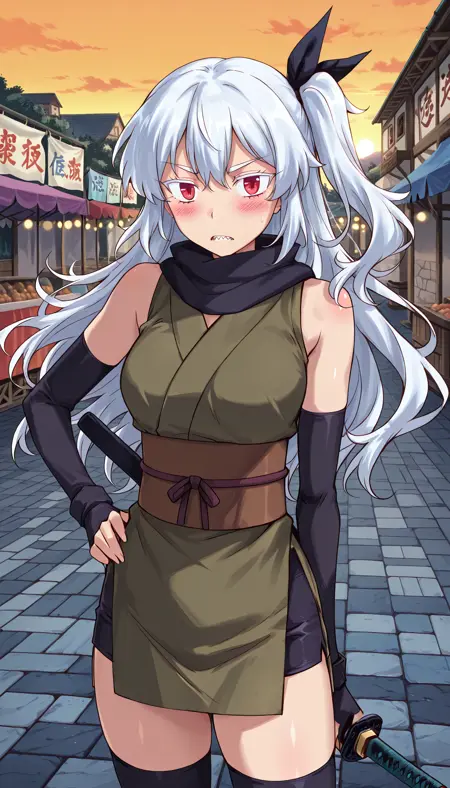 — 她是一位目光锐利的年轻忍者,银色双马尾与午夜色丝带相结,全然尽职与警觉。