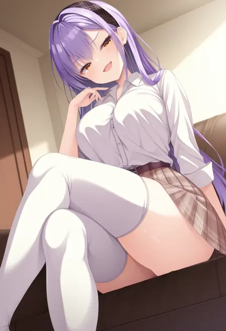 검은 머리띠, 체크 스커트, 갈색 스커트, 주름 스커트, 갈색 벨트, 흰색 셔츠, 칼라 셔츠,