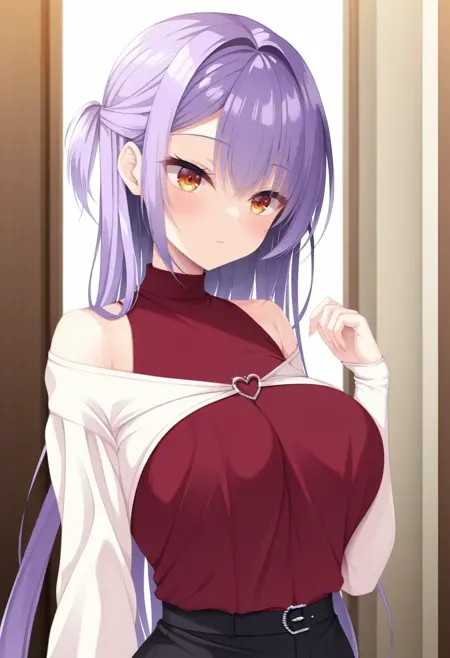 반쪽 머리묶음, 한쪽 위로 올린 머리, 어깨 노출, 빨간 셔츠, 터틀넥 셔츠, 소매 없는 셔츠, 검은 치마, 연필 치마, 하트 O 링, O 링 소매, 흰색 소매,