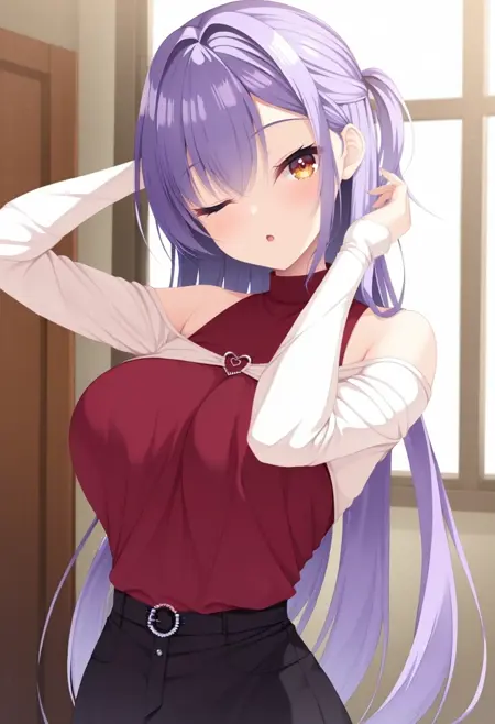半高发髻,单侧束发,露肩,红色衬衫,高领衬衫,无袖衬衫,黑色裙子,铅笔裙,心形圆环,圆环袖,白色袖子,