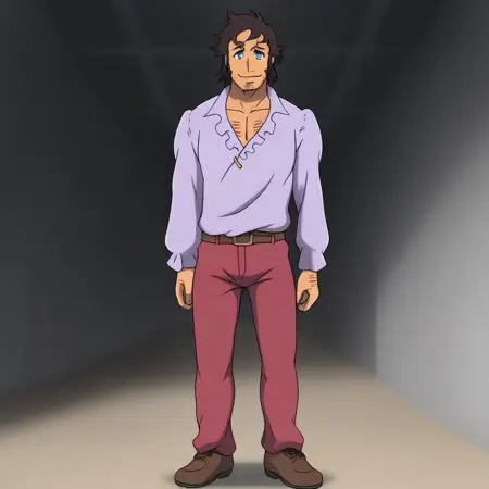 Charles, solo, mature male, muscular, collard shirt, arm hair, brown hair, blue eyes, pectoral cleavage, thick eyebrows, facial hair, sideburns, stubble, brown belt, pinkish purple top, long sleeves, pinkish red pants, brown shoes,