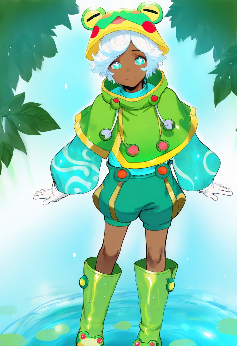 如果想用他们的基础服装,请使用此提示:1boy,男性焦点,milio(英雄联盟),青蛙帽,青蛙连帽斗篷,大袖子,蓝色漩涡图案,蓝色T恤,防水连帽斗篷,翠绿色眼睛,星星状瞳孔,深色皮肤,短发,白发,白色手套,青蛙雨靴,绿色短裤,宽松短裤。