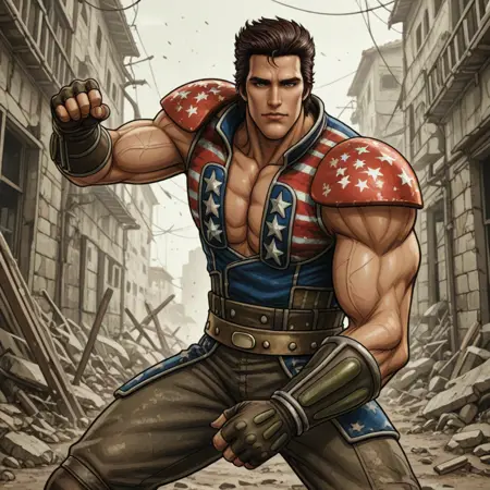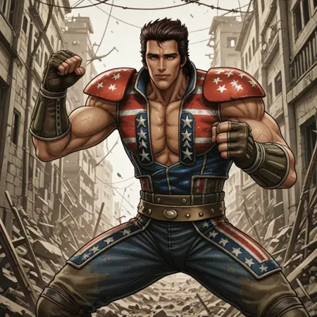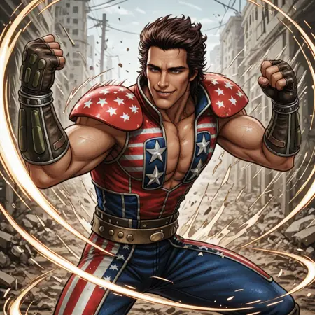 blue and red jacket with american flag print, red shoulder pads with star \(symbol\), arm guards, fingerless gloves,
