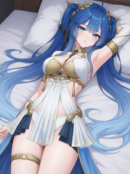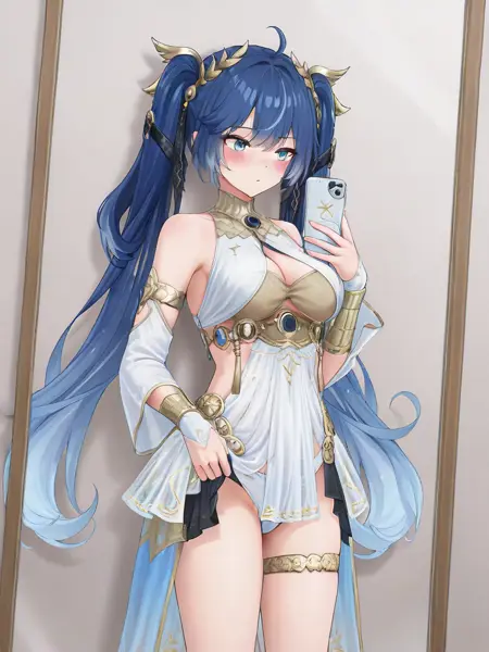 iuno,1girl,twintails,blue hair,hair ornament,looking at viewer,detached collar,separate skirt,panties,midriff,detached sleeves,hemline,thighs,bandages,bandaged leg,high heels,
