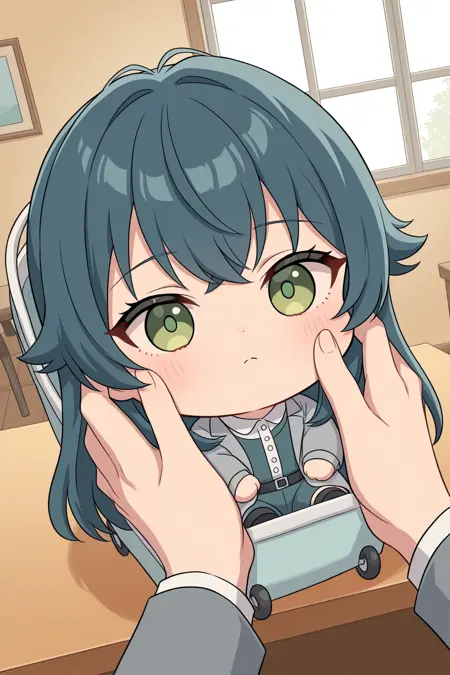또한 그녀의 특징을 강조하기 위해 **"치비, 파란 머리, 녹색 눈"**이 필요합니다.