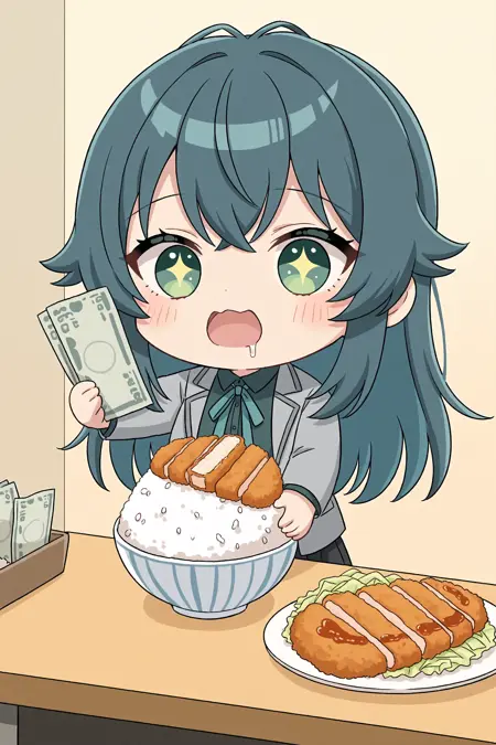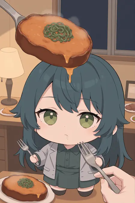 You also need "chibi, blue hair, green eyes" to emphasize her features.