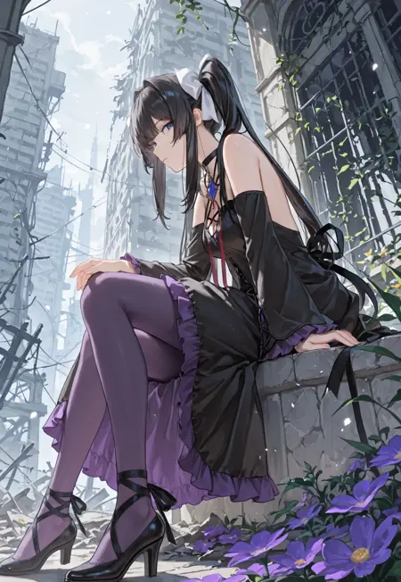 tairitsu_reunion、長髪、黒髪、ツインテール、長いツインテール、前髪、白いリボンのツインテール、側髪、中程度の胸、黒いドレス、バンドドレス、クロスレースドレス、胸元、肩出し、取り外し可能な袖、長袖、ふわふわ袖、フリル袖、黒いチョーカー、ダイヤモンドの宝石、赤いレース、長いスカート、紫のフリル、紫のレギンス、黒いハイヒール、レースアップヒール