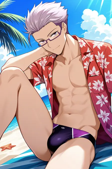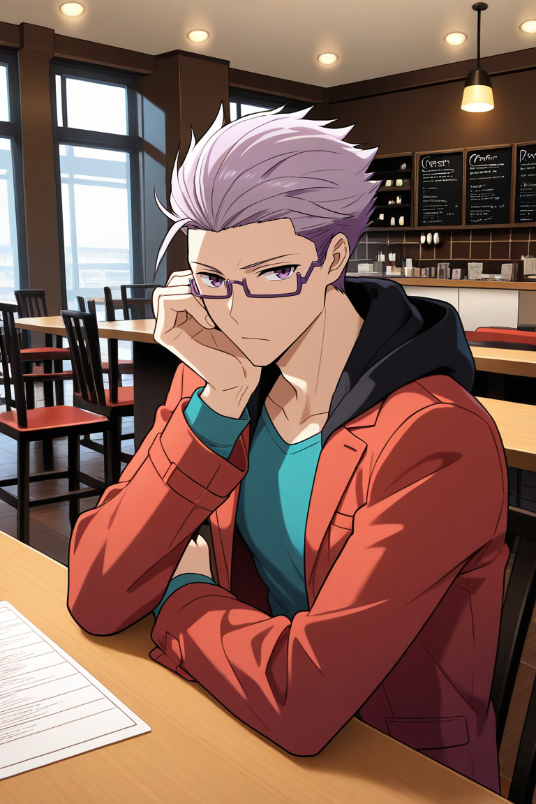 服装: 紫の眼鏡、下縁眼鏡、赤いジャケット、黒いフーディー、ターコイズシャツ