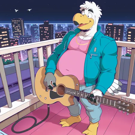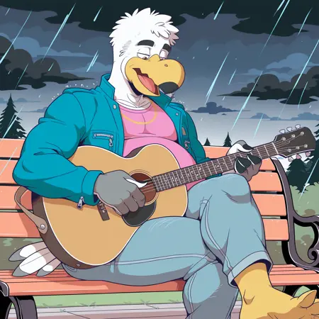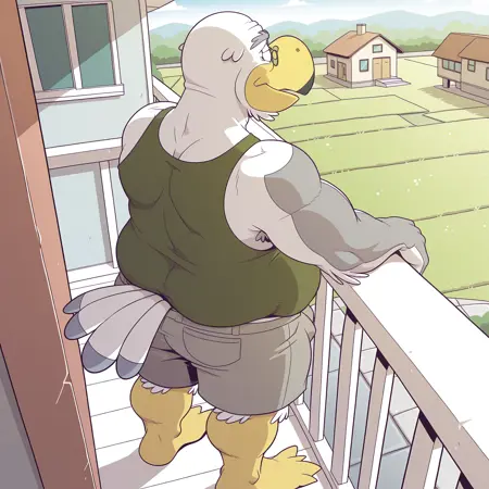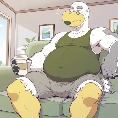 1boy, male, mature male, furry, anthro, bird, seagull, solo, white feathers, two-tone feathers, brown eyes, grey eyebrows, yellow beak, short beard, 4 fingers, yellow feet, webbed feet, tail feathers, fat, plump