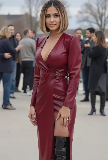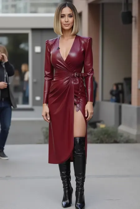 这款LoRA灵感源自2020年一位《美国偶像》评委所穿的标志性YSL橡胶裹身裙,带来大胆、高光泽的时尚风格。裙子采用浓郁的酒红色乙烯基材质,配有蓬松长袖、结构化肩部和深V领,是一款经典的中长款裙装,结合了修身剪裁与裹身式腰带设计,完美展现迷人曲线。适合引人注目的晚装场合,散发自信、奢华与大胆的优雅气质。