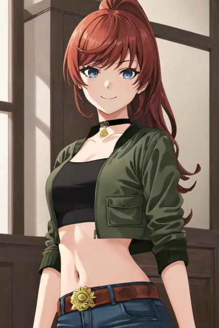 기본 복장 생성 시, 목줄, 초록색 자켓, 오픈 자켓, 검은 셔츠, 트러블탑, 배꼽, 벨트, 청바지 태그를 포함하세요.