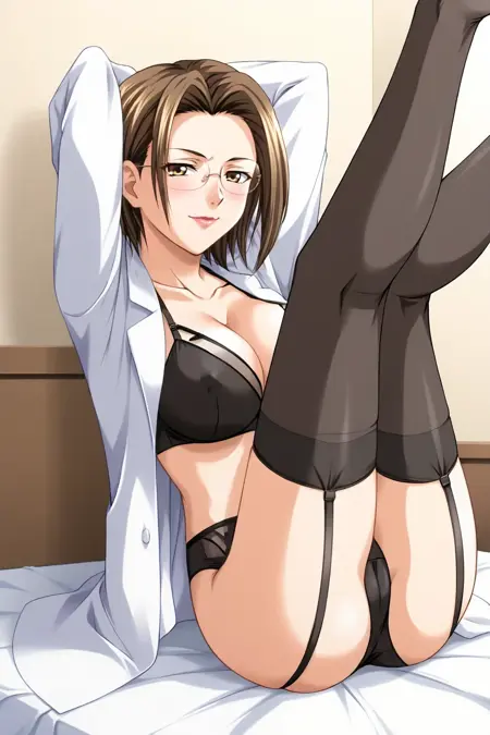 labcoat, lingerie, black garter belt, breasts, covered nipples, large breasts, thighhighs, black panties, lipstick, black bra,