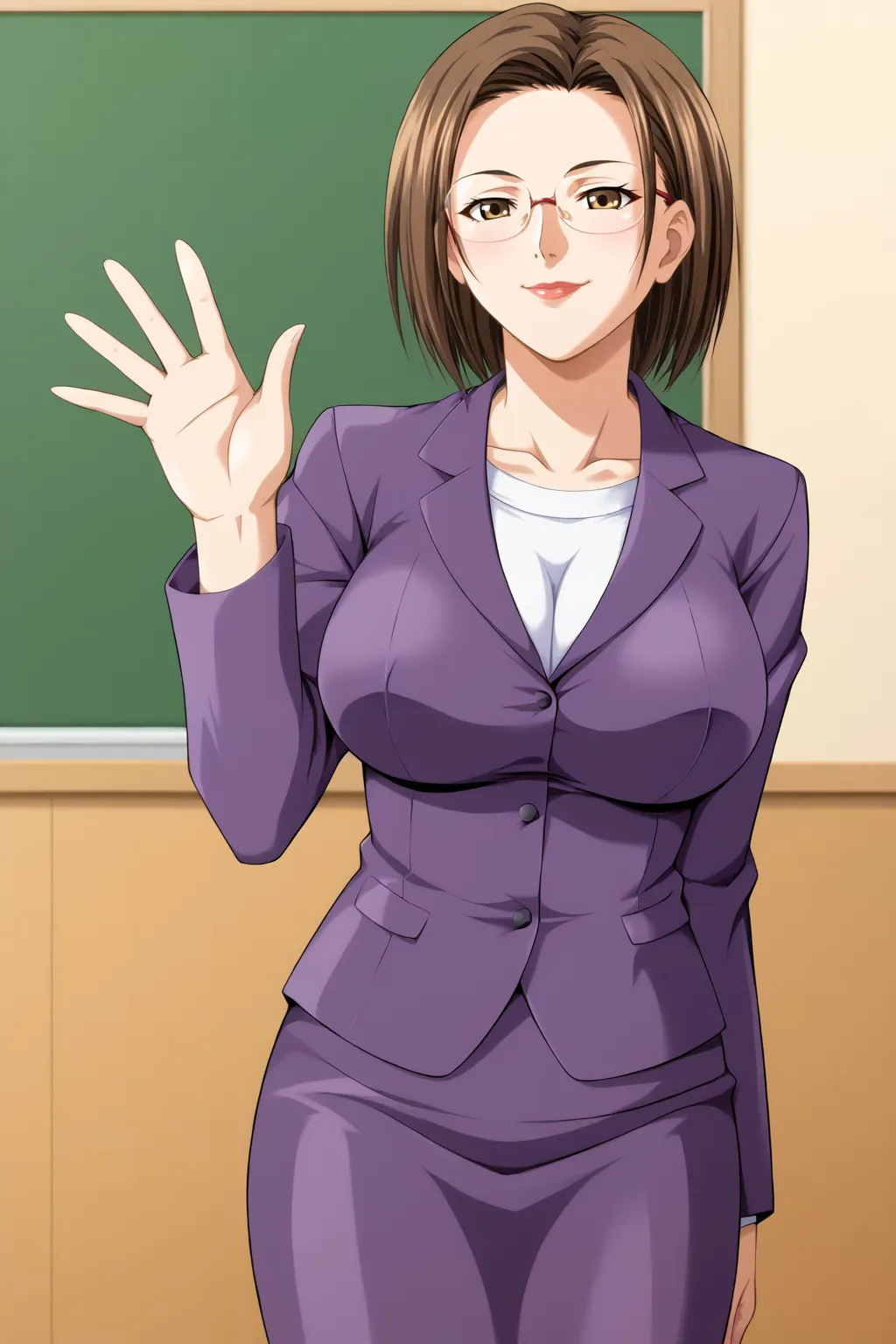 purple business suit, skirt suit, breasts, large breasts, teacher,