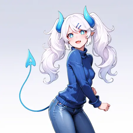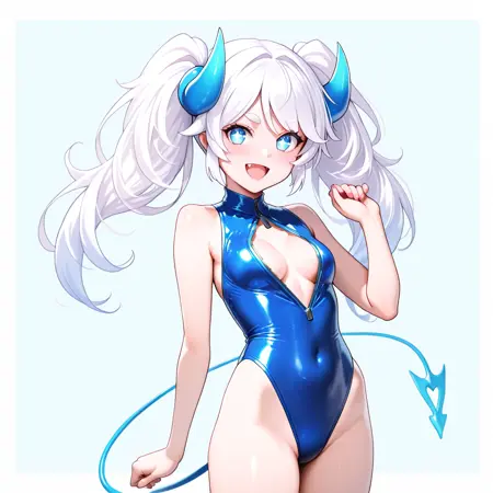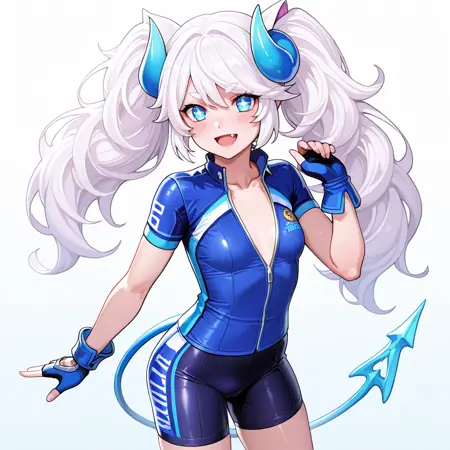 Trigger : Chilarch, 1girl, blue horns, demon tail, twintails, hood, crown, blue eyes, striped, thighhighs, small breasts, symbol-shaped pupils, hoodie, white hair, long hair, navel, shorts, fang, jacket, belt, underboob, asymmetrical legwear, demon horns, star-shaped pupils, single shoe, demon girl, cowboy shot