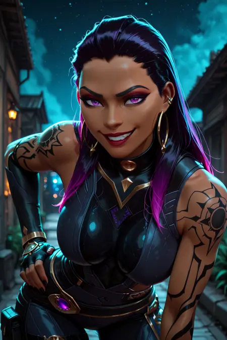 1girl, reyna, 검은 피부를 가진 여자, 귀걸이, 보석, 보라색 눈, 다색 머리, 문신, 검은 머리, 메이크업, 긴 머리, 보라색 머리, 검은 피부, 검은 바디수트, 검은 장갑, 벨트, 손가락 없는 장갑, 가슴