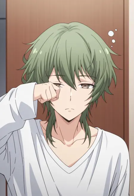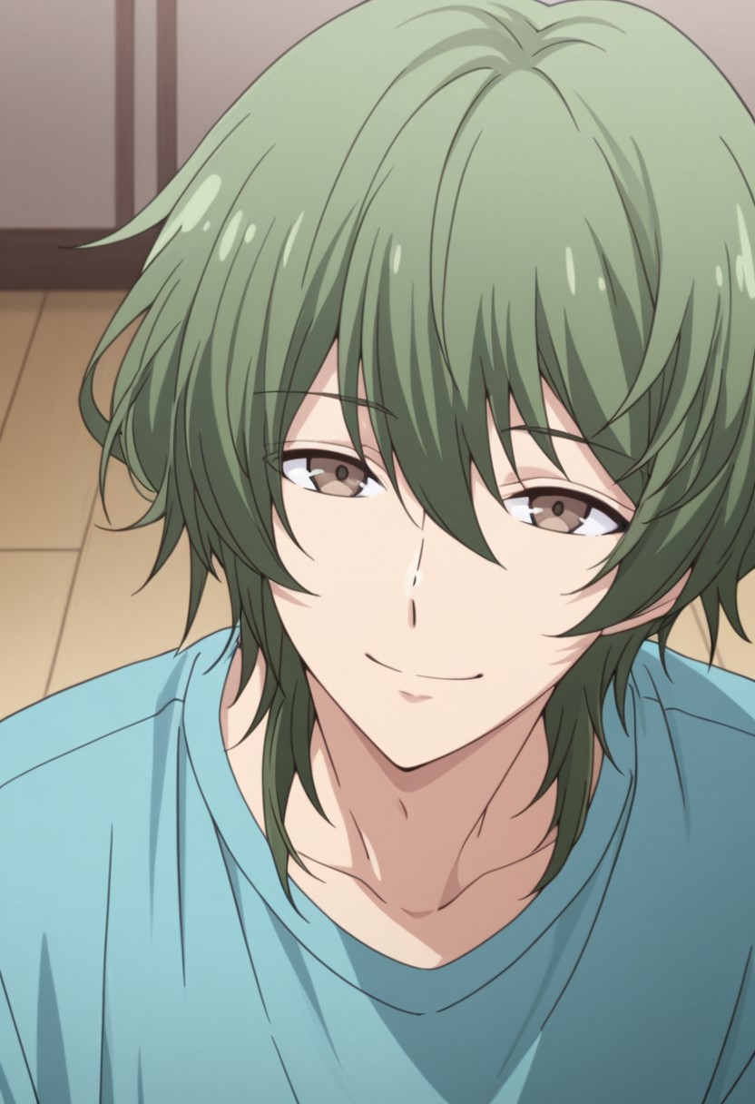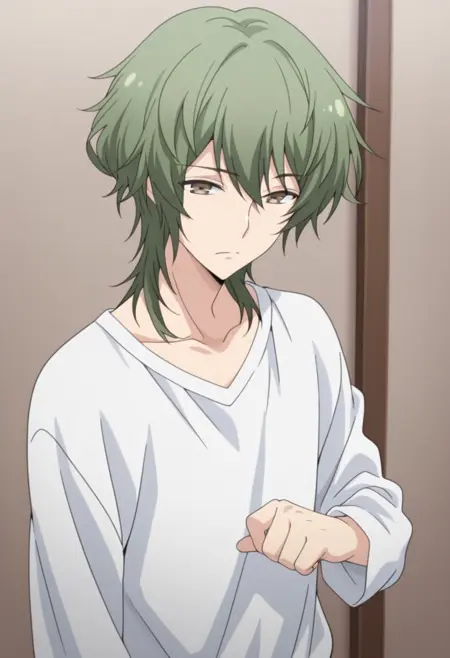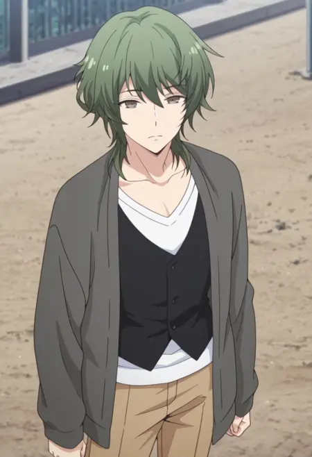 1个男孩,男性焦点,单独一人,棕色眼睛,绿色头发,锁骨,白色衬衫,灰色夹克,敞开式夹克,黑色背心,棕色长裤,