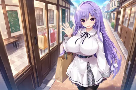 보라색 머리, 매우 긴 머리, 앞머리, 아호게, 양쪽 땋은 머리, 머리에 끼운 것, 머리 장식, 보라색 눈, 거대한 가슴,