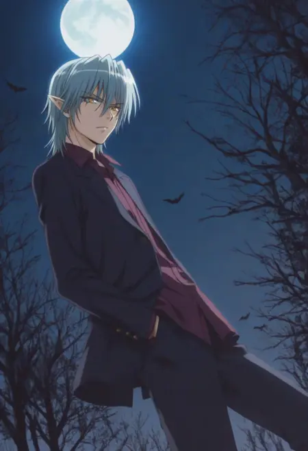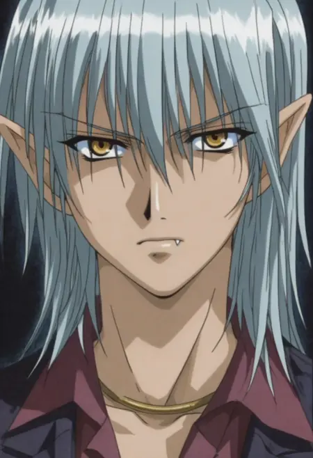 Ren Maaka, light blue-silver hair, yellow eyes, pointed ears, vampire fangs, yellow necklace, black open blazer, burgundy collared undershirt, black pants