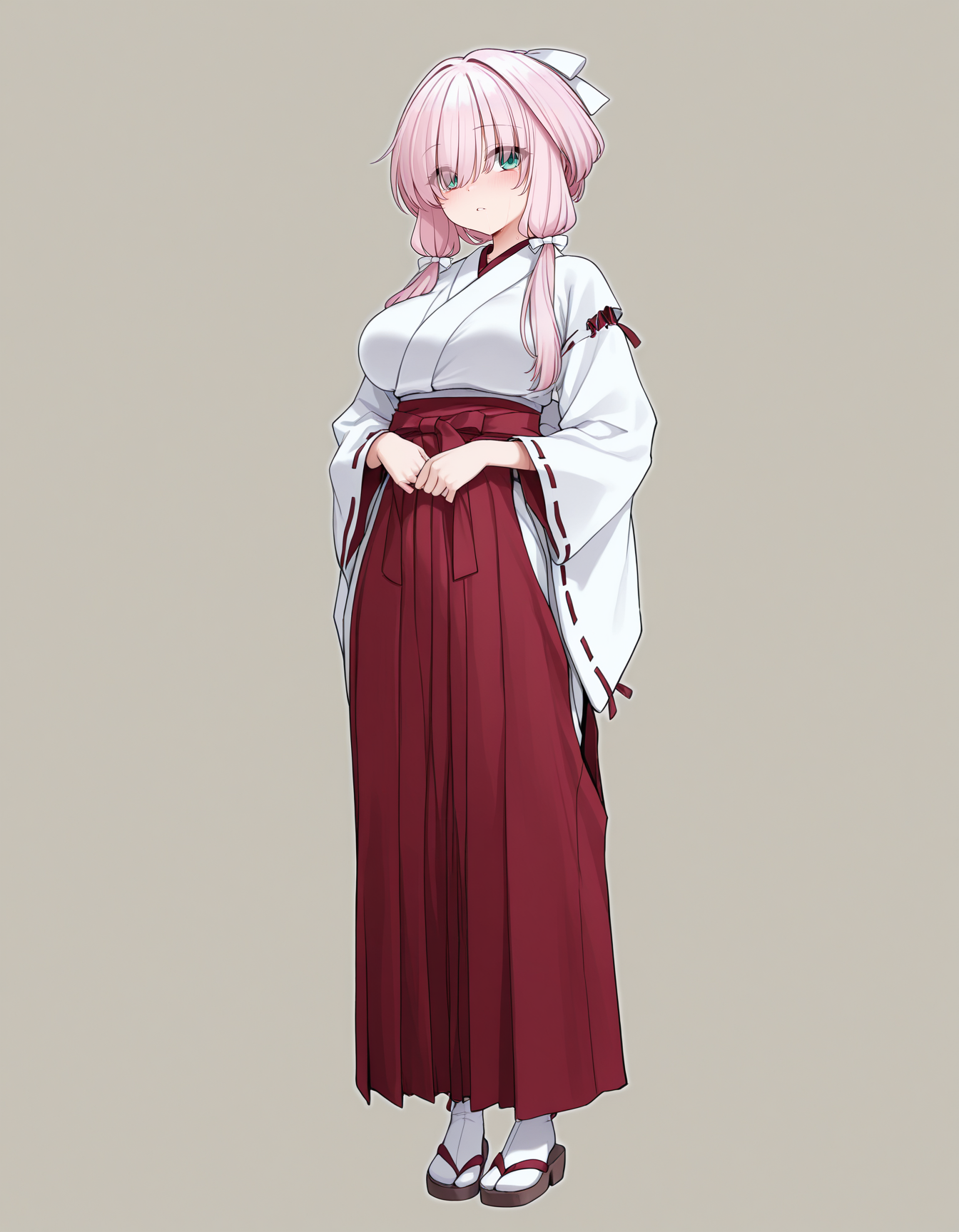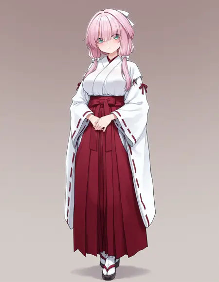 mai_zymiko,long_hair,low_twintails,pink_hair,hair_between_eyes,eyes_visible_through_hair,aqua_eyes,hair_bow,white_bow,white_kimono,ribbon-trimmed_sleeves,red_hakama