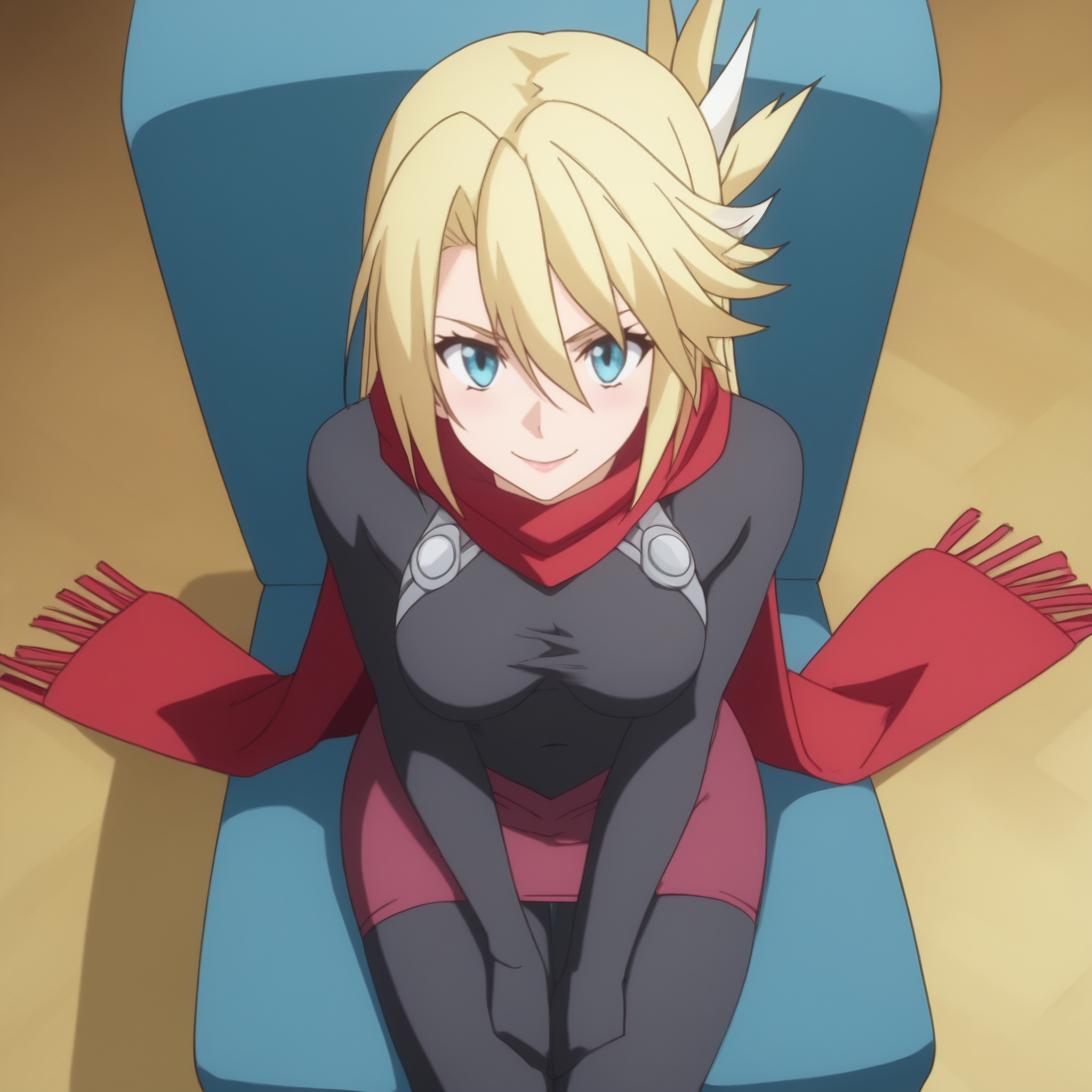 black bodysuit, skin tight, red skirt, red scarf, long sleeves,
