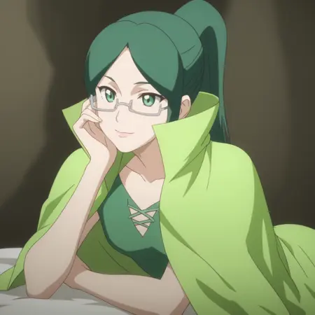 ReMonsterSpinel, green eyes, green hair, long hair, ponytail, parted bangs, sidelocks, semi-rimless eyewear, under-rim eyewear,