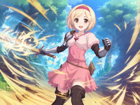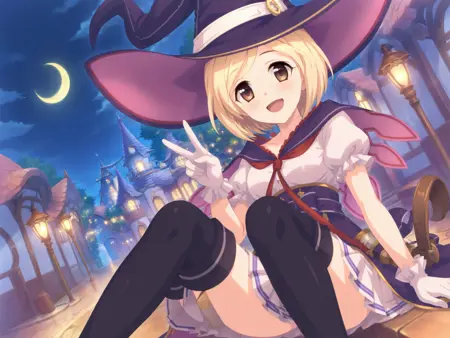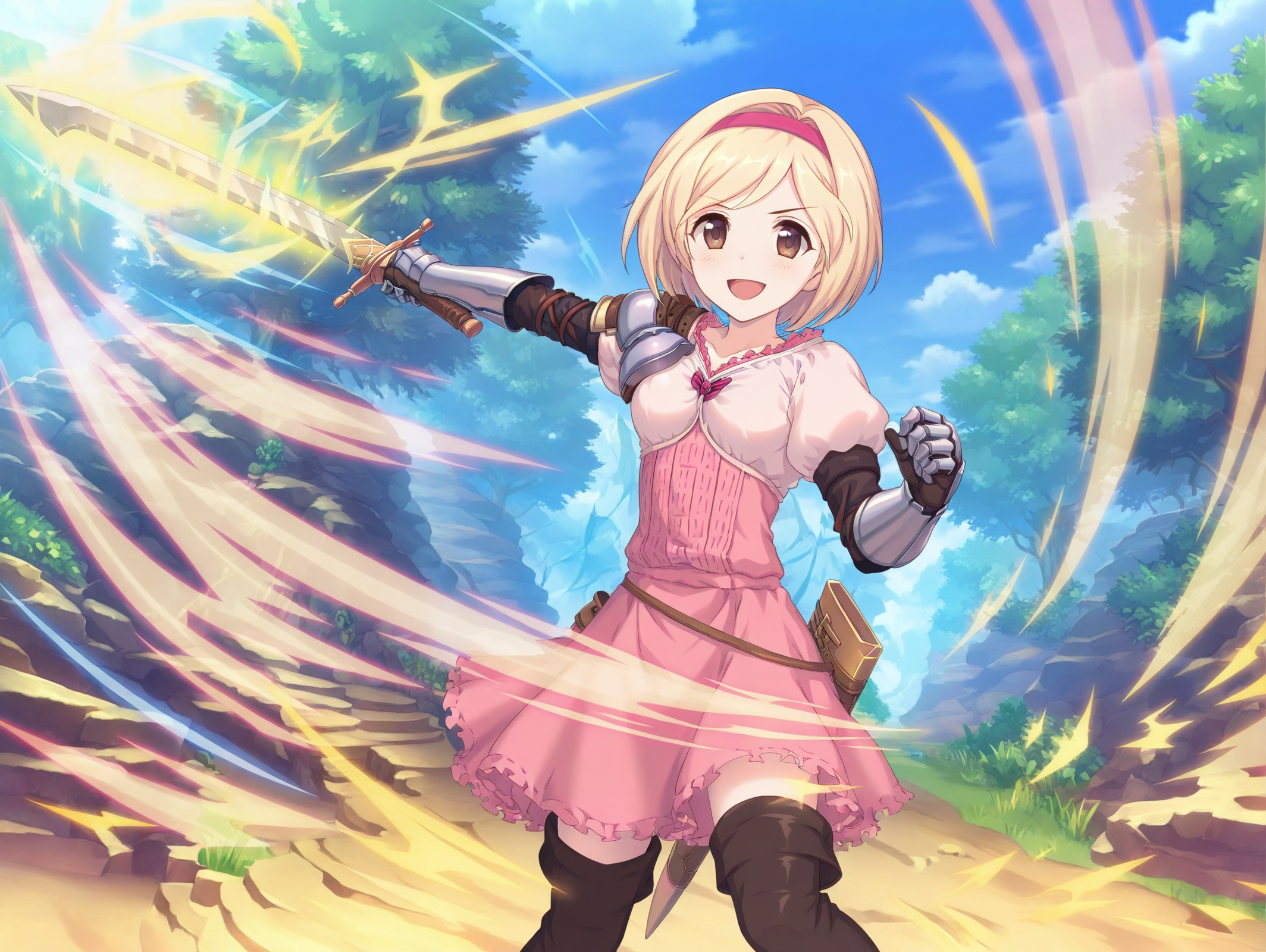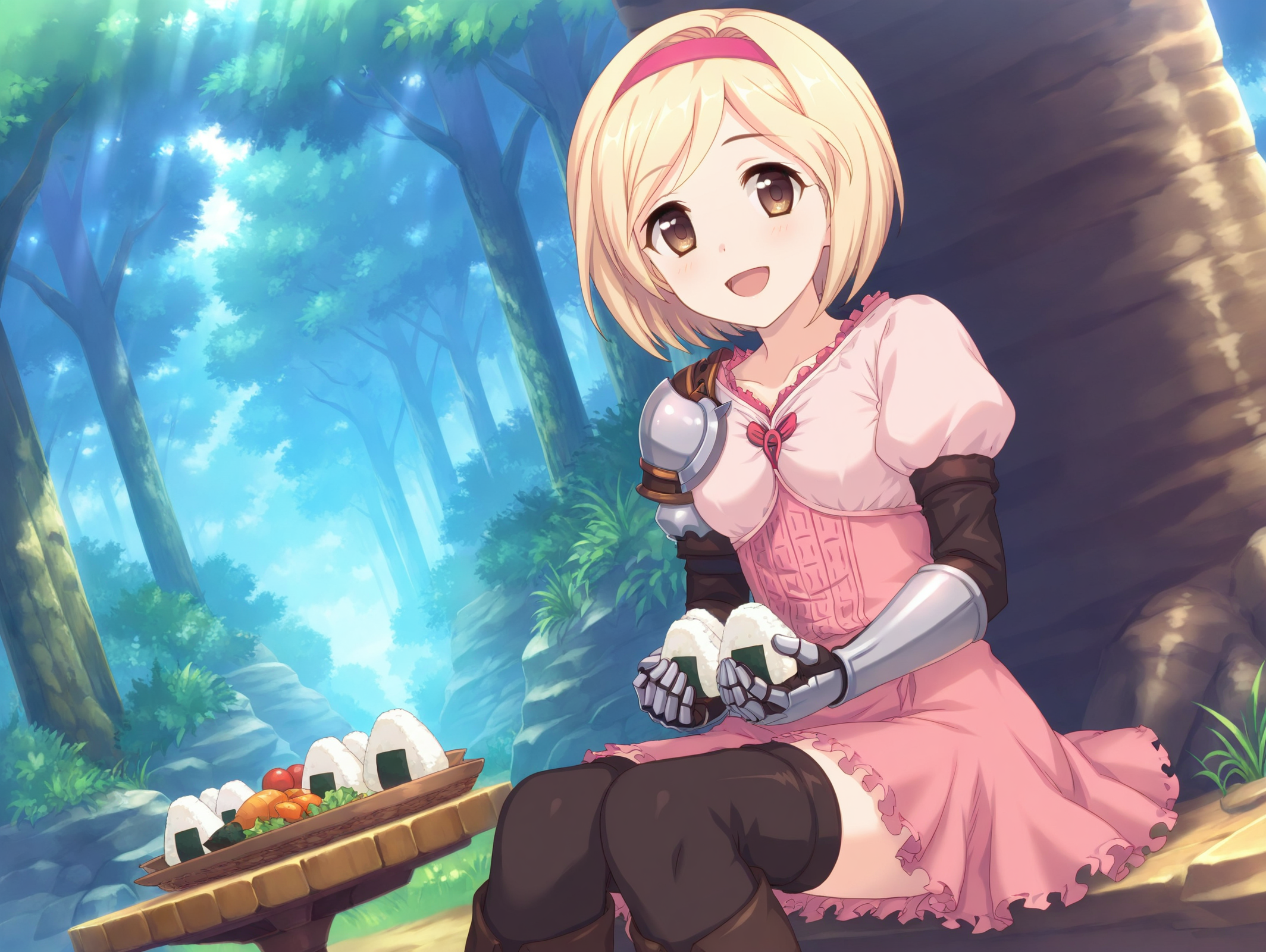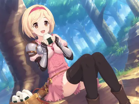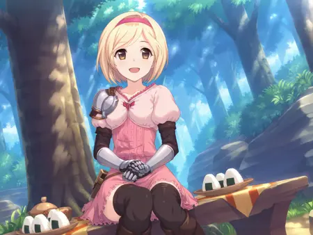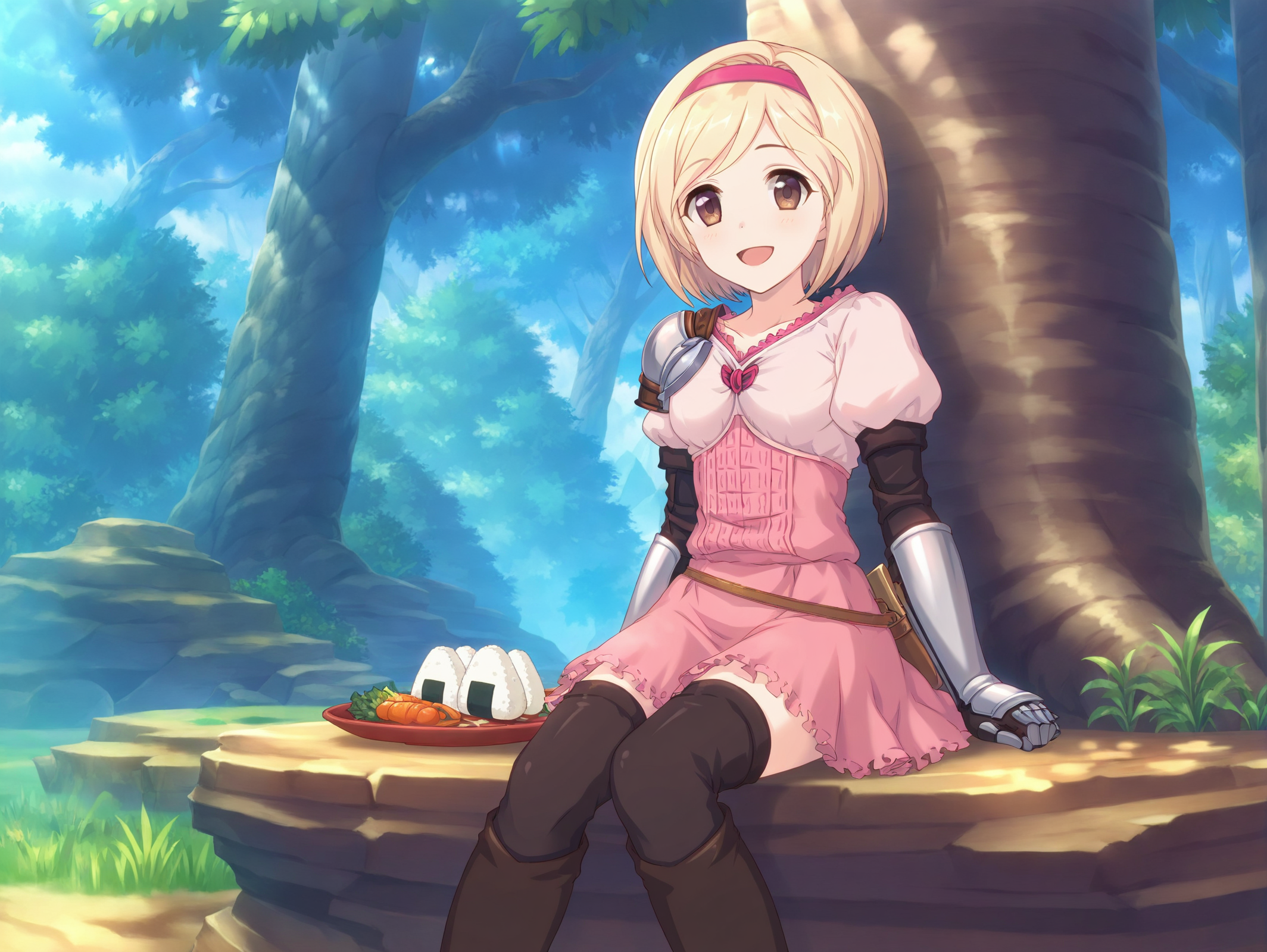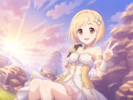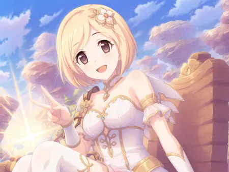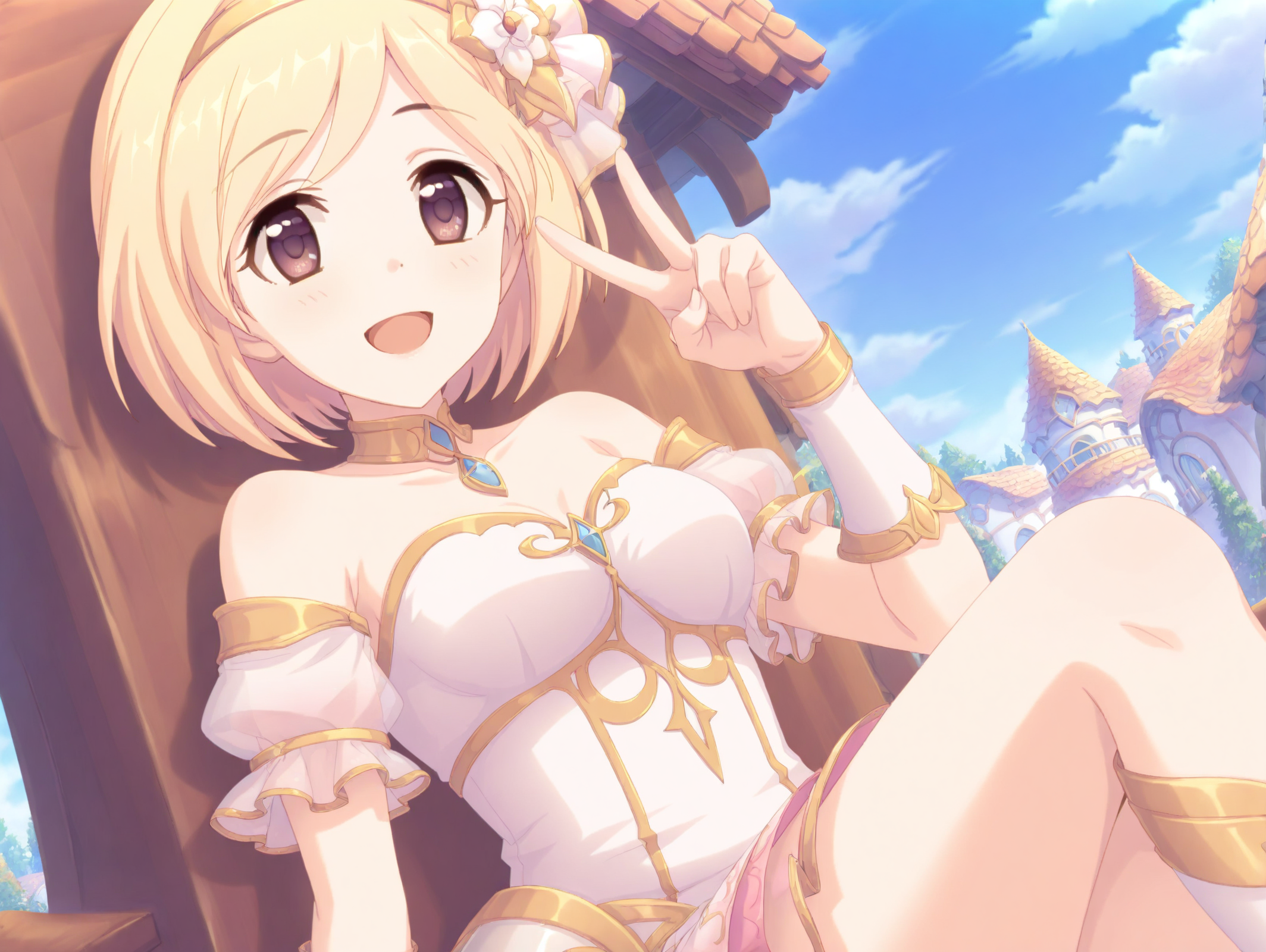 absurdres,official style,lora:Djeeta5464:1,1girl,djeeta,princess connect!,solo,blonde hair,short hair,hair ornament,dress,brown eyes,hair flower,thighhighs,white dress,medium breasts,flower,holding,detached sleeves,day,sky,strapless,outdoors,bare shoulders,v,:d,sitting,