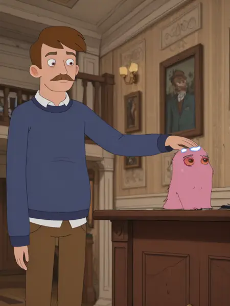 cute monster, pink fur, tentacles, red sclera, green eyes,