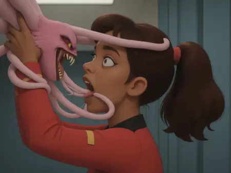 monster, open mouth, sharp teeth, pink fur, tentacles, red sclera, green eyes,