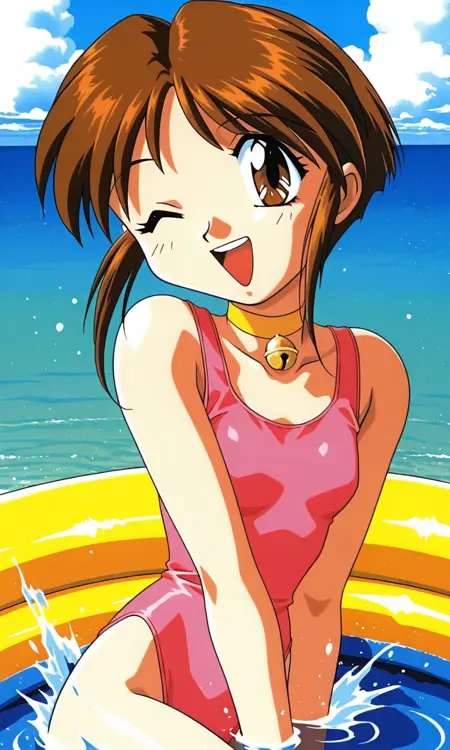 PROMPT: masterpiece,best quality,amazing quality,anime screencap,retro artstyle, 1girl,mill varna,1990s style,petite,brown hair,short hair,sidelocks,brown eyes,small breasts,navel,pink criss-cross halter,pink halterneck,,pink long skirt,pink ribbon,blue poncho,jewelry,necklace,