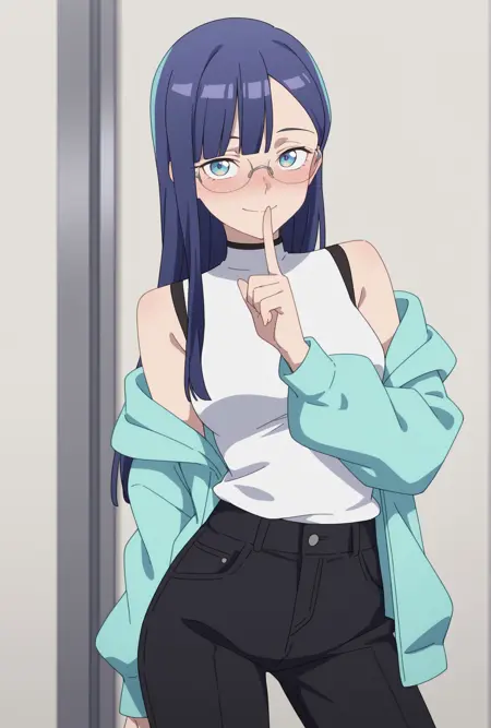 toof2_casual, aqua jacket, black pants, white tank top, off shoulder, sleeveless shirt, black trim, glasses,