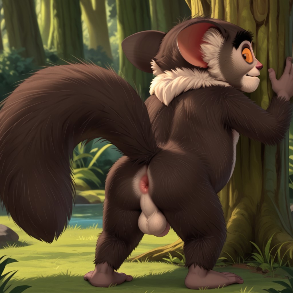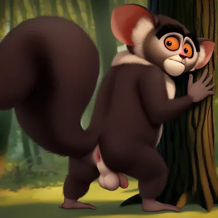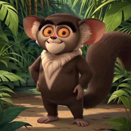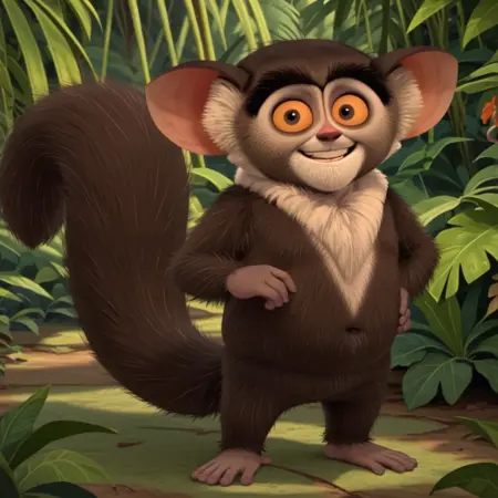 primate, lemur, grey and white fur, orange sclera, black pupils, thick black eyebrows, pink nose, large ears, inner ear fur, long tail, prehensile feet,