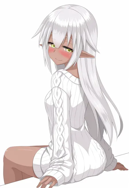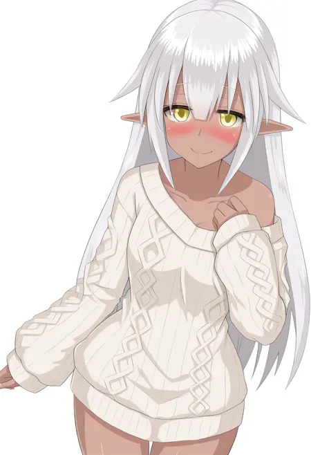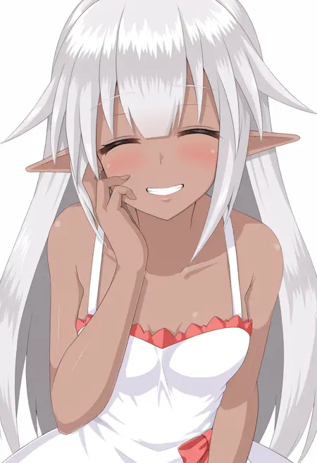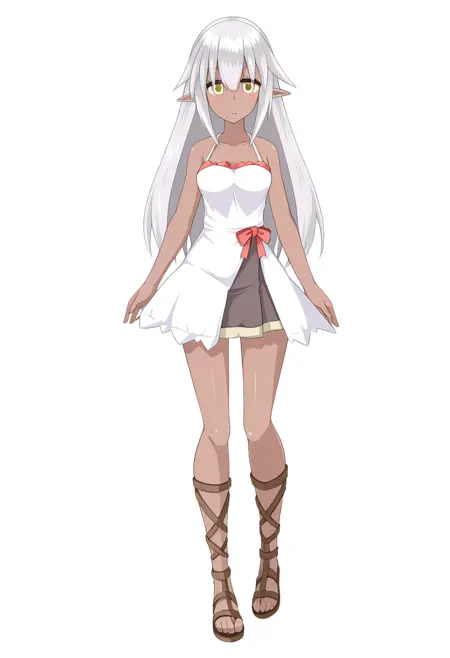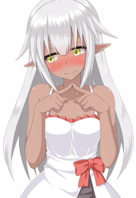 yunoge, 1girl, dark skin, pointy ears, yellow eyes, white hair, long hair, breasts, small breasts,