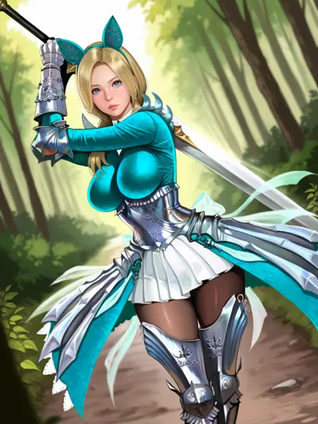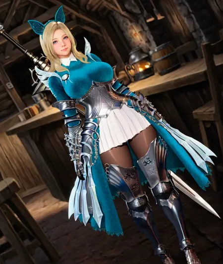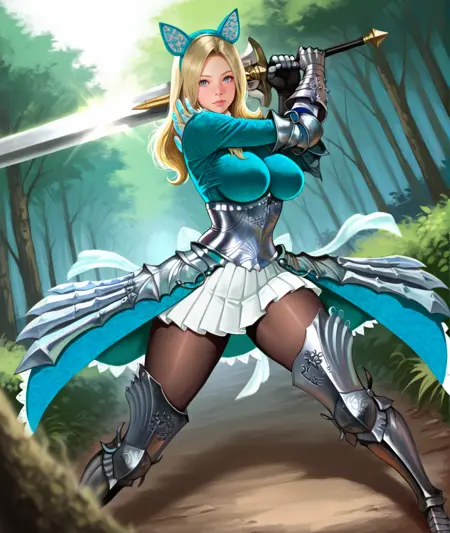 Delia, 1girl, solo, long hair, looking at viewer, blue eyes, large breasts, blonde hair, thighhighs, pantyhose, pleated skirt, thigh boots, white skirt, gauntlets, corset, armored dress, armored boots, greaves, hairband, blue cat ears, weapon on back,