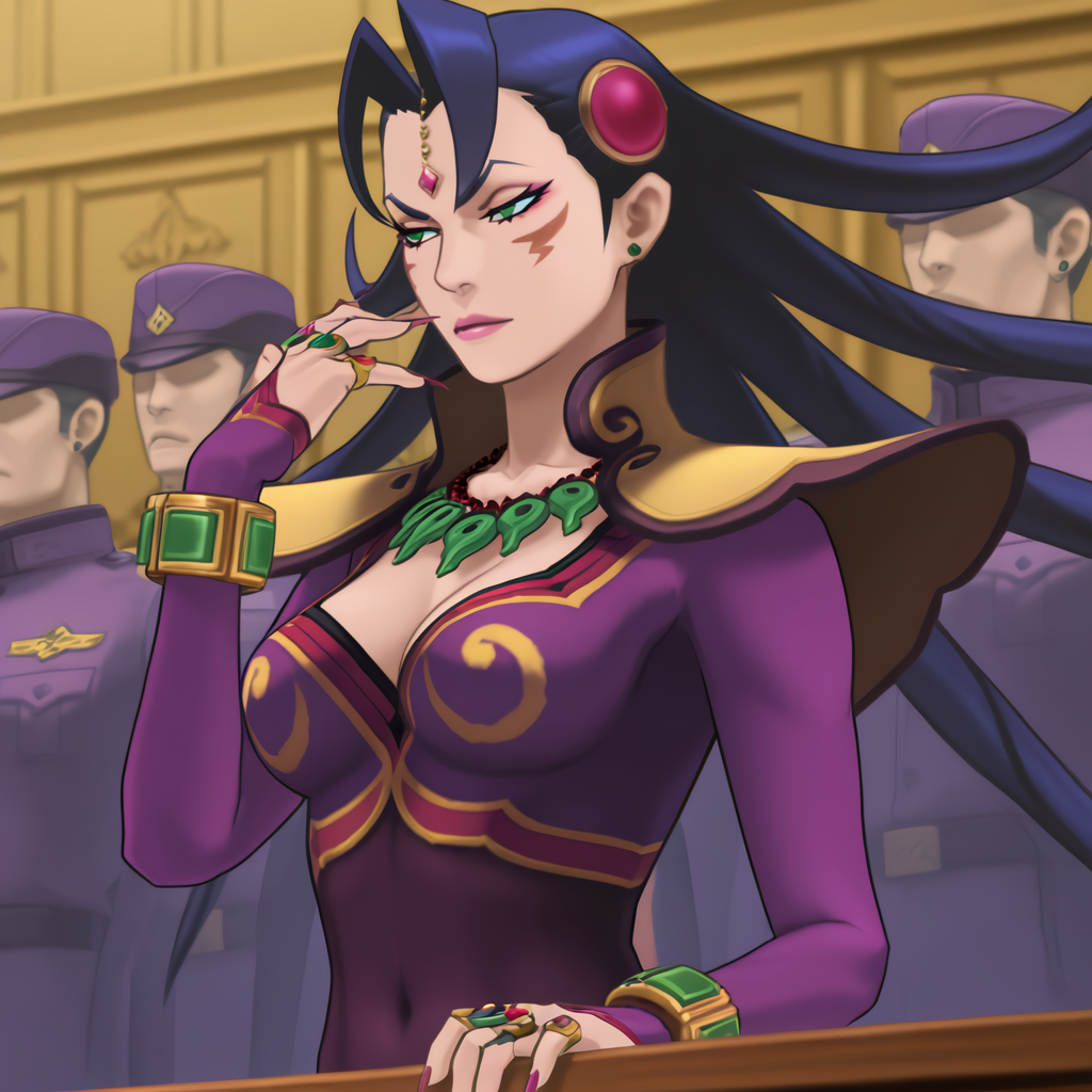 검사 복장 태그: 긴 머리, 이마 보석, 머리 장식, 노란색 어깨 패드, 보라색 상의, 크롭탑, 마가타마 목걸이, 드러난 배꼽, 보라색 치마, 긴 치마, 긴 손톱, 팔찌, 반지, 보라색 바디스톡킹, 검은 하이힐, 녹색 귀걸이