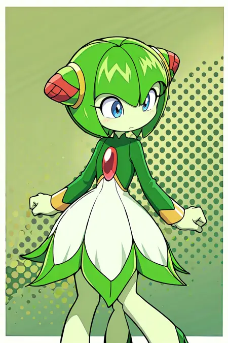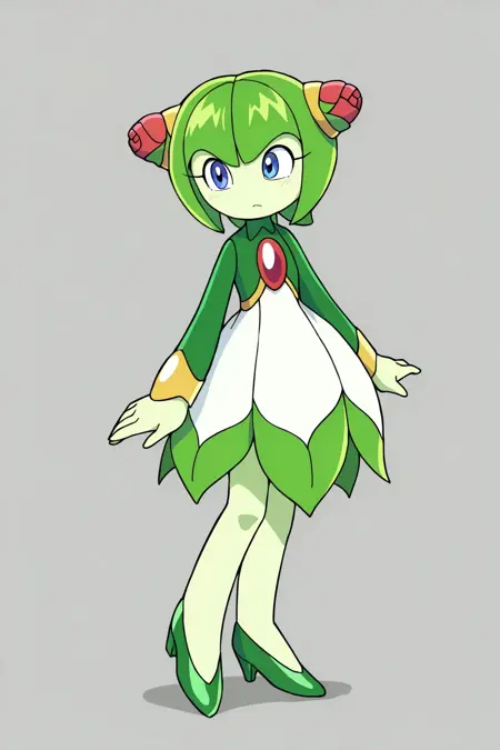 Co0smoSX, 1girl, blue eyes, leaf-green hair, cream colored skin, white petal dress, long green sleeves, green high heels, plant girl, flora fauna, long white flower-shaped skirt, red gem in chest