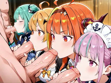 line-up blowjob, group scene, detailed expression, side angle perspective,