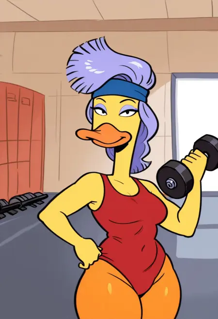 1girl, solo, aunt_bernice, duck girl, anthro, light purple hair, blue headband, mullet, light purple eyeshadow, red swimsuit, yellow legs, thick thighs, blue bikini with pink polka dots