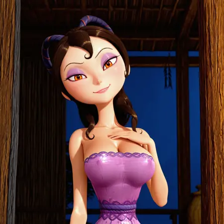 | 训练词汇 | ladytrollmkhib, mature slim female, luscious lips with lipstick, orange eyes, dark brown hair, purple eyeshadow, blue and red rope bow in hair, purple strapless dress with purple waistband, cleavage, round perky breasts, blue pants without pockets, pants under dress, purple chinese slip-on shoes已复制! |