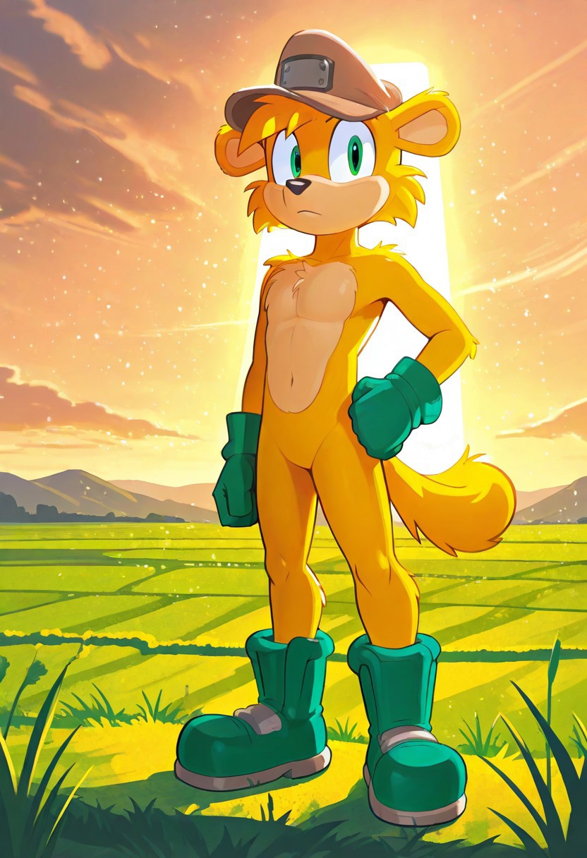 Wombat Stu, yellow fur, jade green eyes, brown hat, yelkow tail, jade green gloves, jade green shoes