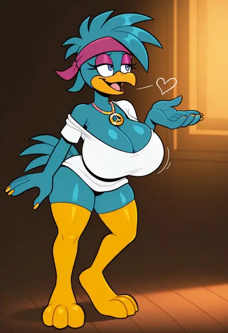 Guru Emu, bird, dark teal fur, blue eyes, yellow beak, teal feathers, yellow and red headband, yellow legs and feet, teal claws, white shirt, gold peace symbol necklace