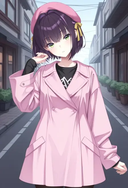 pink beret,hair ribbon,yellow ribbon,pink coat,black shirt,