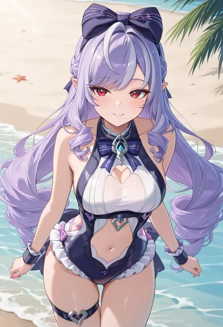 1girl, vivianIofs, 紫髪, 多色髪, 長髪, 尖った耳, 赤い目, 記号, 目の下のほくろ, 髪のリボン, 首元のリボン, フリル付きワンピース水着, ワンピース水着, 肩出し, 水着, 衣服のカットアウト, へそ, フリル付きブレスレット, 太ももストラップ, サンダル