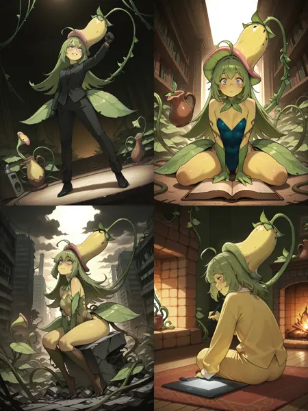 Pokemusu_Bellsprout,green hair,plant girl,monster girl,ahoge,fruit,colored skin,grey eyes,freckles,yellow skin,plant,leaf,vines,pitcher plant hat