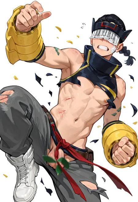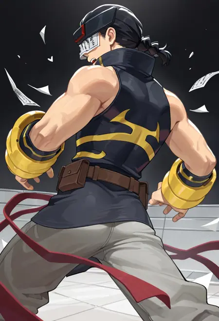 Hero Costume, Visor, Paper Talisman covering eyes, Sleeveless Tunic, High Collar, Red Sash Belt, Brown Pouches, yellow gauntlets, Baggy Grey Pants, White Boots