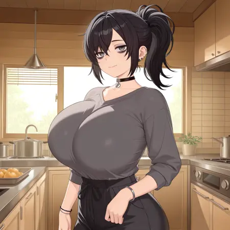 dark hair, dark gray eyes, ponytail, bags under eyes, ear_piercing, ponytail
